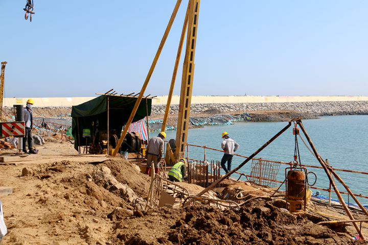 目前,東區(qū)油品碼頭工程,正在實(shí)施灌注樁施工,已經(jīng)完成23條。同時(shí)進(jìn)行的還有基槽挖泥施工和靜載試樁平臺(tái)搭設(shè)以及沉箱底座鋼筋綁扎、建設(shè)梁板預(yù)制場(chǎng),其中梁板預(yù)制場(chǎng)已經(jīng)完成80%的建設(shè)工程,即將具備預(yù)制開工條件。