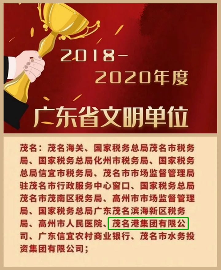 近日,廣東省精神文明建設(shè)表彰大會(huì)在廣州隆重舉行。作為成立僅八年多時(shí)間的市屬?lài)?guó)有企業(yè),茂名港集團(tuán)榮獲廣東省2018-2020年度文明單位稱(chēng)號(hào)。