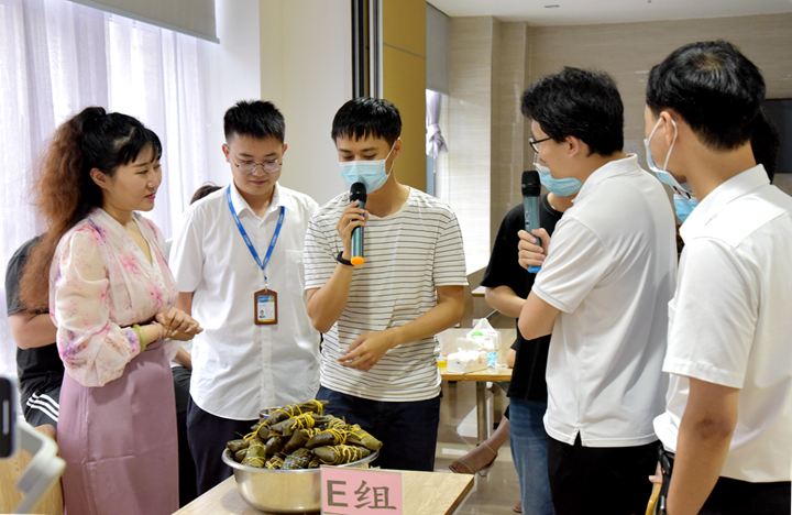 包粽子比賽通過人員交叉搭配進(jìn)行分組比賽。在嫻熟的“老手”作現(xiàn)場示范講解后,各組隊(duì)員紛紛動手上陣。只見組員之間分工合作、相互配合,折粽葉、裝糯米、放餡料、裹扎繩……大家紛紛拿出自己的“拿手絕活”。30分鐘的比賽里洋溢著歡聲笑語,各位選手巧手翻飛,一個個形態(tài)各異的粽子瞬間成型。最后,大會裁判以“速度、質(zhì)量、美觀、衛(wèi)生”為評判標(biāo)準(zhǔn)對各組粽子進(jìn)行了評選。