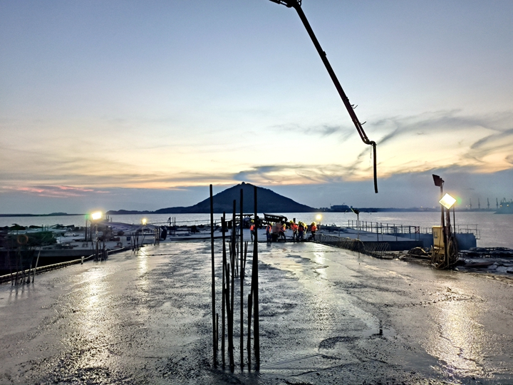 ▲油品碼頭工程水域公用管廊棧橋面層澆筑完成 本工程的公共管廊全長4384m,包括陸域公共管廊和水域公共管廊兩部分,水域公用管廊棧橋長度2400m,寬11m~15m,陸域公共管廊棧橋長1984m,寬10.5m~15m。其中陸域公共管廊棧橋橋面已經(jīng)于2021年10月份施工完成。本次施工完成的是水域公用管廊棧橋現(xiàn)澆面層,水域公共管廊棧橋面層是茂名港博賀新港區(qū)東區(qū)油品碼頭工程重要工程節(jié)點(diǎn),更是整體工程的關(guān)鍵銜接點(diǎn)。