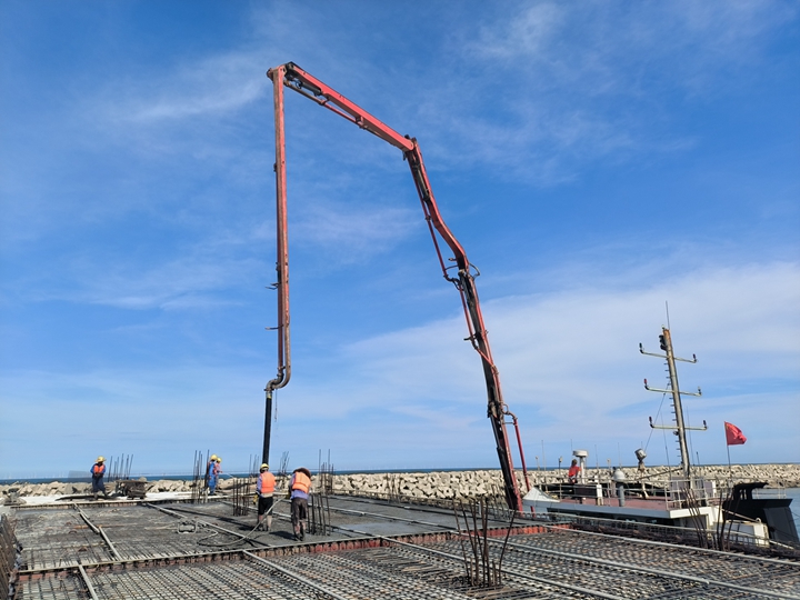 ▲油品碼頭工程水域公用管廊棧橋面層澆筑施工 油品碼頭項(xiàng)目臨時(shí)黨支部深入貫徹習(xí)近平新時(shí)代中國特色社會(huì)主義思想,緊緊圍繞茂名港集團(tuán)黨委“項(xiàng)目為王”工作部署,以茂名港口岸開放時(shí)間節(jié)點(diǎn)為目標(biāo),加強(qiáng)基層黨組織的建設(shè),把支部建設(shè)在工程一線上,充分發(fā)揮黨支部的戰(zhàn)斗堡壘作用,積極肩負(fù)建設(shè)單位組織、溝通、協(xié)調(diào)的主體責(zé)任,切實(shí)做到責(zé)任不“臨時(shí)”。通過統(tǒng)籌設(shè)計(jì)、監(jiān)理及施工單位的技術(shù)人員力量,成立技術(shù)攻關(guān)小組、黨員示范崗,帶頭展開“立項(xiàng)式”攻關(guān)。經(jīng)過精心組織,科學(xué)施工,不斷優(yōu)化方案,加強(qiáng)工序銜接,合理調(diào)配資源,克服疫情影響、海上風(fēng)浪大、作業(yè)面交叉施工、施工難度大等難點(diǎn),做到了工程安全有保障、工程質(zhì)量穩(wěn)定可控、工程進(jìn)度有序推進(jìn)。