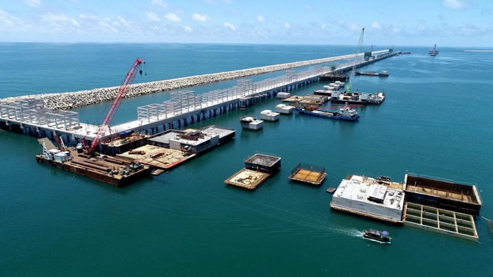 3×5萬(wàn)噸級(jí)油氣化工碼頭項(xiàng)目港池疏浚已完成,沉箱預(yù)制完成86%、安裝完成54%,胸墻澆筑完成26%,項(xiàng)目總體進(jìn)度完成63%;