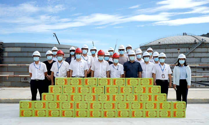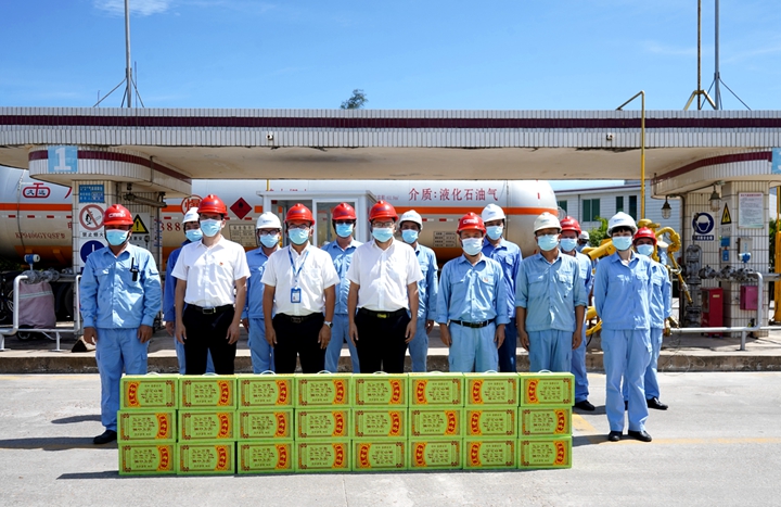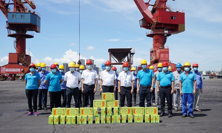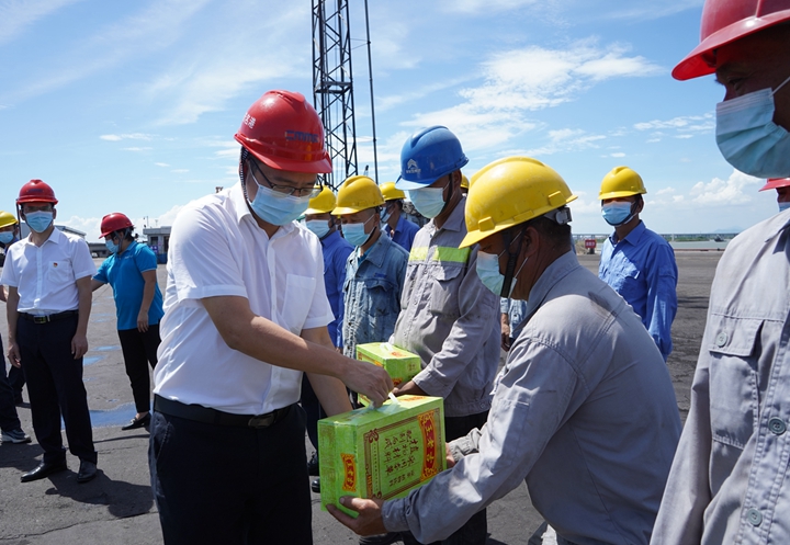 7月14日,集團(tuán)黨委委員、副總裁、工會主席楊超燦率隊到集團(tuán)下屬港口經(jīng)營公司碼頭作業(yè)現(xiàn)場、中油王港公司庫區(qū)、博賀新港區(qū)重點項目施工現(xiàn)場等處“送清涼”,為奮戰(zhàn)一線的職工發(fā)放防暑降溫飲品、用品。