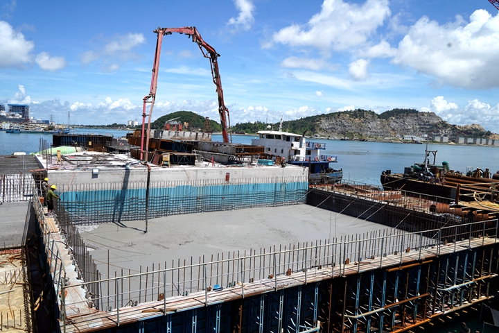 ▲東區(qū)化工碼頭項(xiàng)目胸墻澆筑作業(yè) 集團(tuán)當(dāng)前在建的10萬(wàn)噸級(jí)成品油碼頭、東區(qū)化工碼頭等碼頭泊位建設(shè)進(jìn)入沖刺階段,認(rèn)真貫徹市委市政府關(guān)于加快口岸開(kāi)放工作的要求,計(jì)劃今年竣工驗(yàn)收;茂名港務(wù)中心已完成主體結(jié)構(gòu)施工,計(jì)劃今年建成投用,將為濱海新區(qū)樹(shù)立嶄新地標(biāo);30萬(wàn)噸級(jí)原油碼頭報(bào)批報(bào)建工作取得重大突破,項(xiàng)目岸線申請(qǐng)獲得國(guó)家交通運(yùn)輸部批復(fù),前期工作不斷加快推進(jìn),即將進(jìn)入實(shí)質(zhì)性實(shí)施階段,現(xiàn)代化深水大港的畫卷徐徐展開(kāi)。 挖潛增效,劃轉(zhuǎn)老國(guó)企扭虧為盈,實(shí)現(xiàn)國(guó)有資產(chǎn)保值增值。