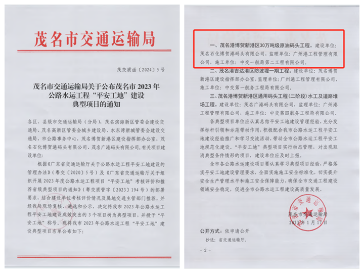 1月17日,茂名市交通運輸局公布了茂名市2023年公路水運工程“平安工地”建設(shè)典型項目的表彰名單,茂名港集團下屬企業(yè)投資建設(shè)的茂名港博賀新港區(qū)30萬噸級原油碼頭工程被評為平安工地建設(shè)典型項目,榮獲“平安工地”稱號!