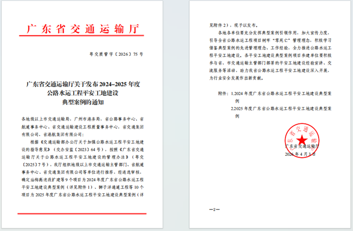 據(jù)悉,本次典型案例遴選嚴(yán)格依據(jù)《交通運輸部辦公廳關(guān)于加強公路水運工程平安工地建設(shè)的指導(dǎo)意見》(交辦安監(jiān)〔2023〕64 號)及《廣東省交通運輸廳關(guān)于公路水運工程平安工地建設(shè)的管理辦法》(粵交〔2025〕7 號)文件要求,由廣東省交通運輸廳組織地級以上市交通運輸主管部門、省航道事務(wù)中心、省交通集團有限公司等單位聯(lián)合推薦,經(jīng)多輪嚴(yán)格遴選審核后最終確定,全省僅9個項目入選2024年度典型案例,充分彰顯了本次榮譽的含金量。